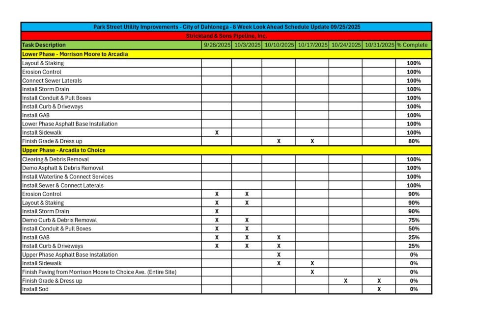 Here’s what was completed in the last two weeks: Stormwater work is completed. Sewer main installation and sewer later installations are complete. Information conduit is complete. As of October 6, 2025, all curbs, gutters and sidewalks are complete up to Martin Street. Weather permitting, curb and gutter and sidewalks should be completed to Choice Ave. by October 15th. Weather permitting, paving is set for October 16th.